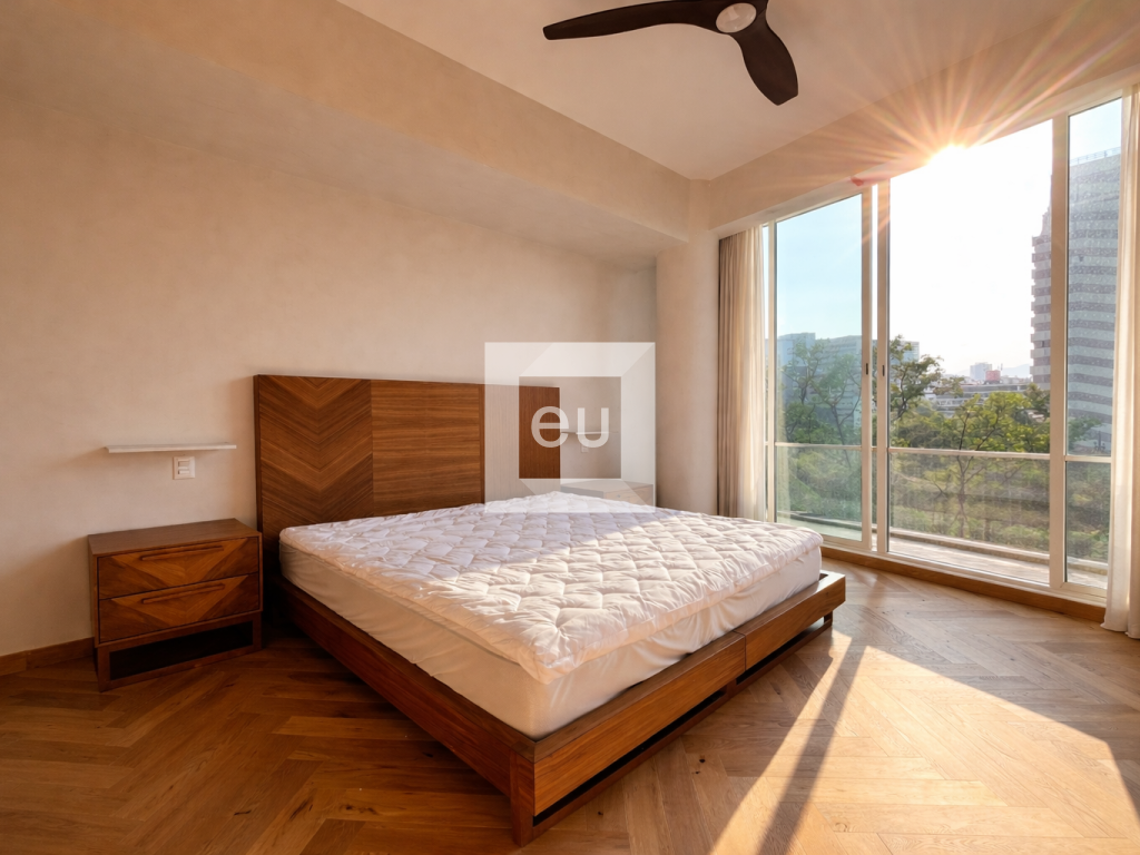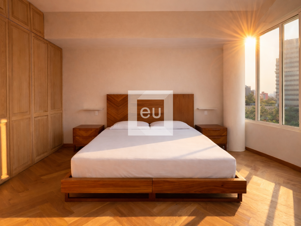 El departamento ofrece pisos de madera de excelente calidad, una recámara con cama king size y burós, y un baño. La cocina está completamente equipada con estufa con horno, horno de microondas, freidora, refrigerador, lavasecadora y lavavajillas, brindando gran funcionalidad y comodidad.
