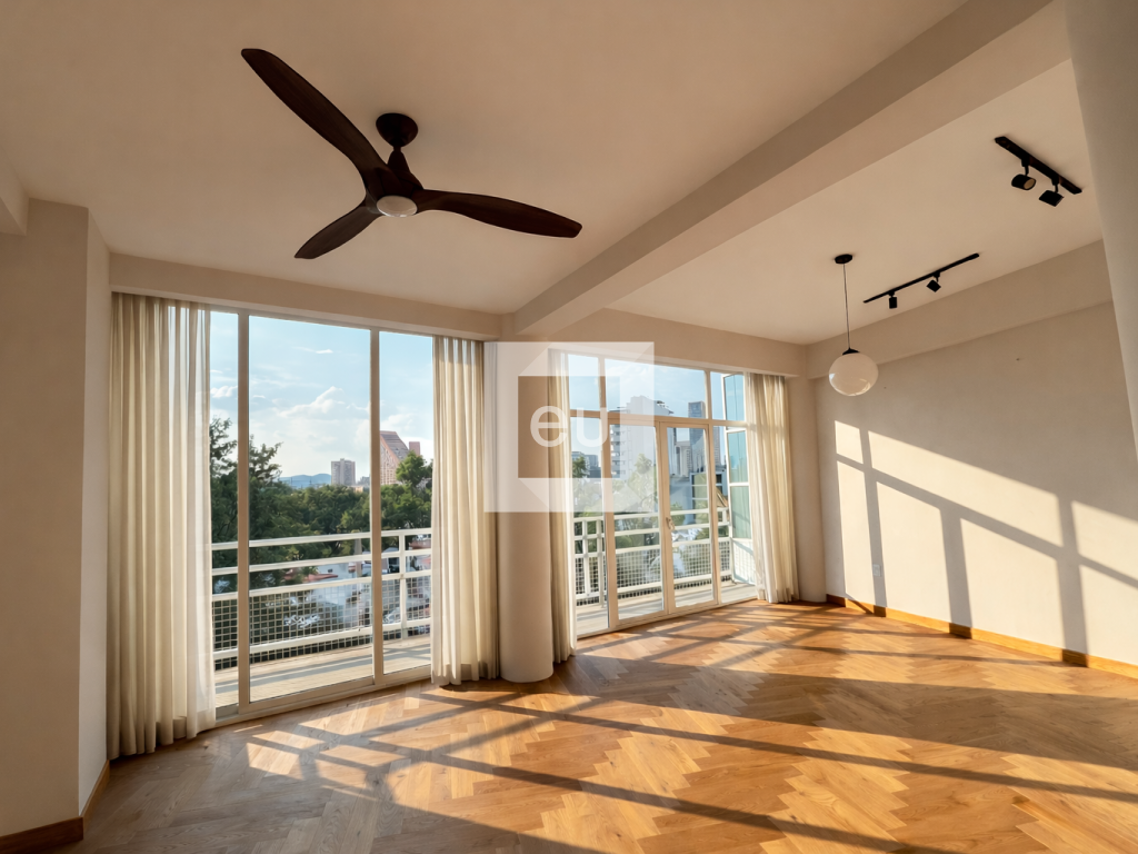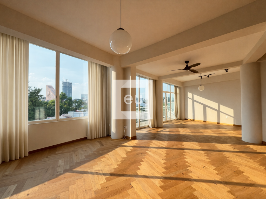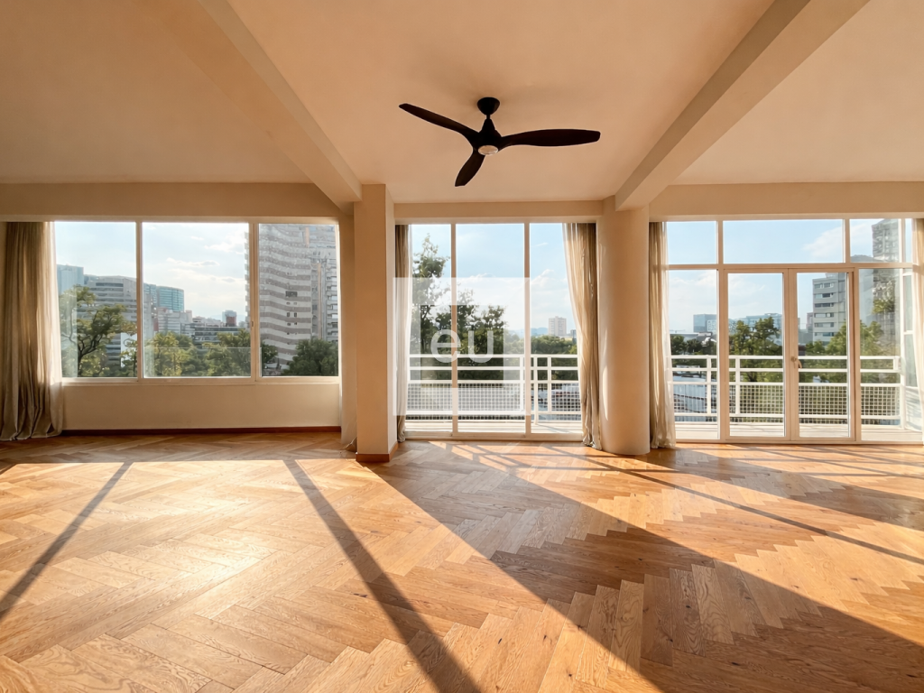Se encuentra en el sexto piso y destaca por su extraordinaria luz natural, sus vistas panorámicas abiertas a la ciudad y sus techos altos, que acentúan la sensación de amplitud y elegancia. Toda la estancia cuenta con amplios ventanales que permiten una luz increíble y enmarcan de manera espectacular el entorno.