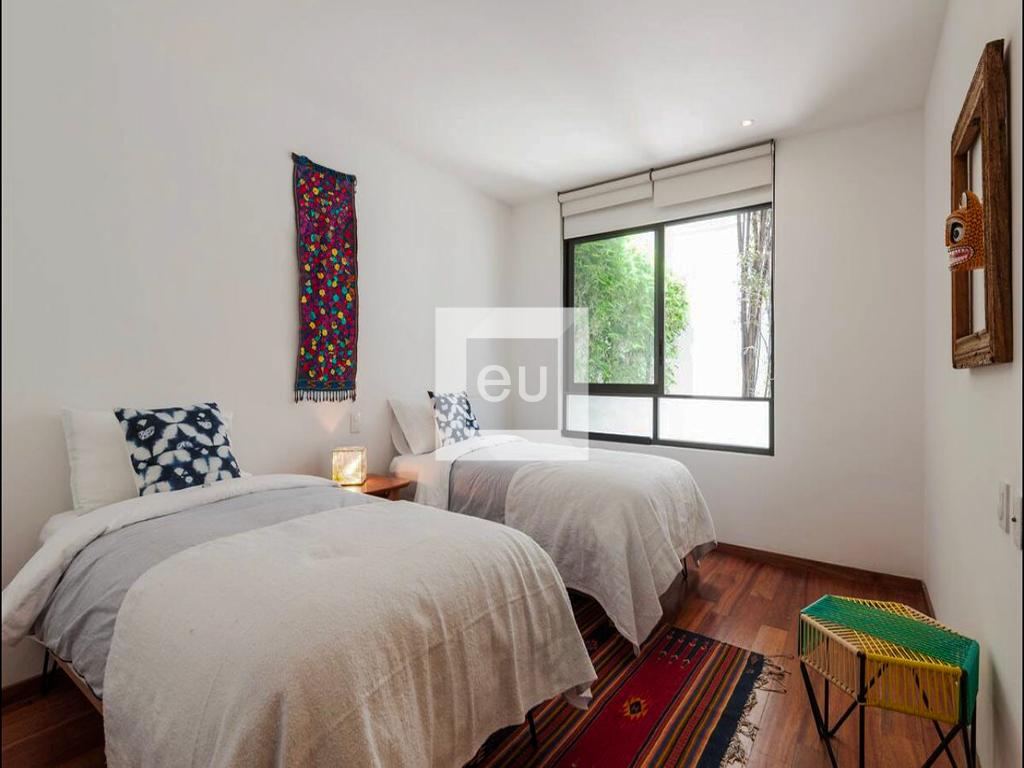 Departamento amueblado en edificio moderno de pocos departamentos. Tiene muy buenos espacios, pisos de madera y barra de granito en la cocina. Se encuentra en una calle muy tranquila y poco transitada. El edificio tiene vigilancia 24 hrs y cuenta con dos lugares de estacionamiento.