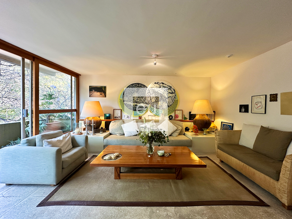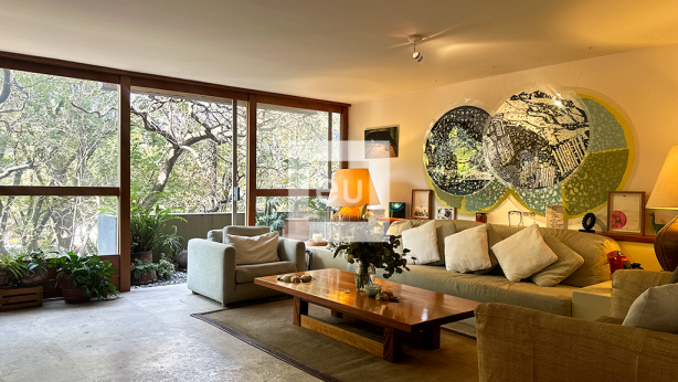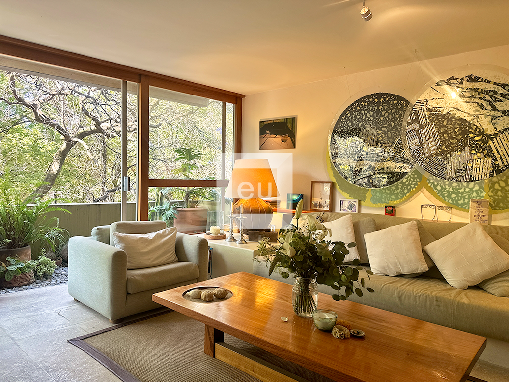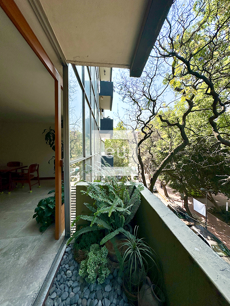 Remodeled apartment for sale across from Parque México, located in a 1970s building. It boasts tree-lined views directly overlooking the park. The spacious living area receives excellent natural light and ventilation, with access to a balcony facing a jacaranda tree that blooms in spring. The kitchen is separate, with a breakfast bar and ample storage. It also includes a naturally ventilated laundry area, a maid’s quarters with a bathroom, a study or office space, and one parking space.