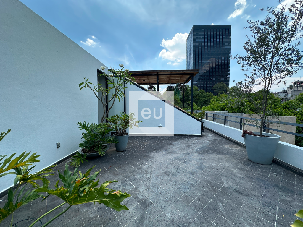 Increíble duplex en edificio moderno de pocos departamentos ubicado en una calle tranquila. Tiene una hermosa vista arbolada y un amplio roof garden privado. Tiene techos altos, muy buena iluminación y excelentes acabados. Cuenta con dos lugares de estacionamiento y bodega.