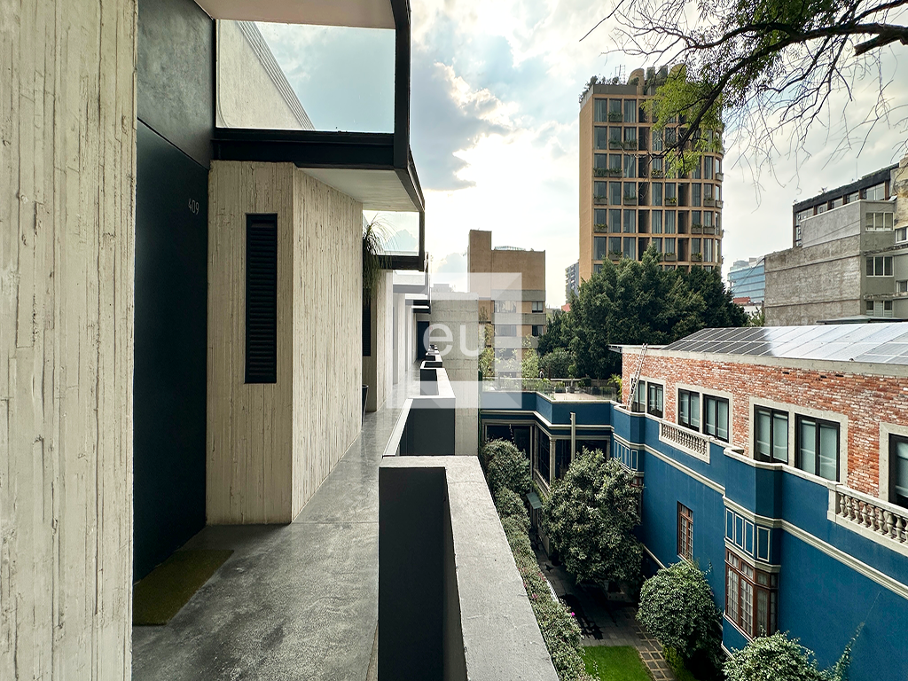 Hermoso departamento duplex con amplias terrazas y vistas arboladas. Arquitectura de primer nivel que estuvo a cargo del despacho de Javier Sanchez. Excelente ubicación a solo unas cuadras de la Plaza Rio de Janeiro. Iluminación y ventilación natural, acabados de lujo, cocina italiana y pisos de madera. Dos recamaras en planta baja y un estudio o tercera recamara, todos con acceso a balcón o pequeña terraza.