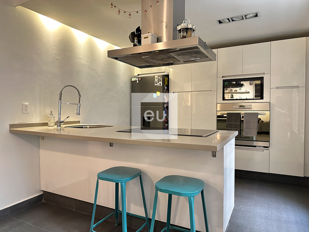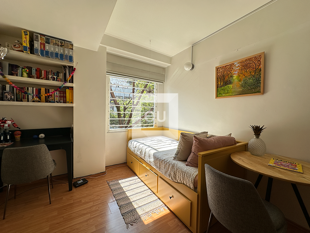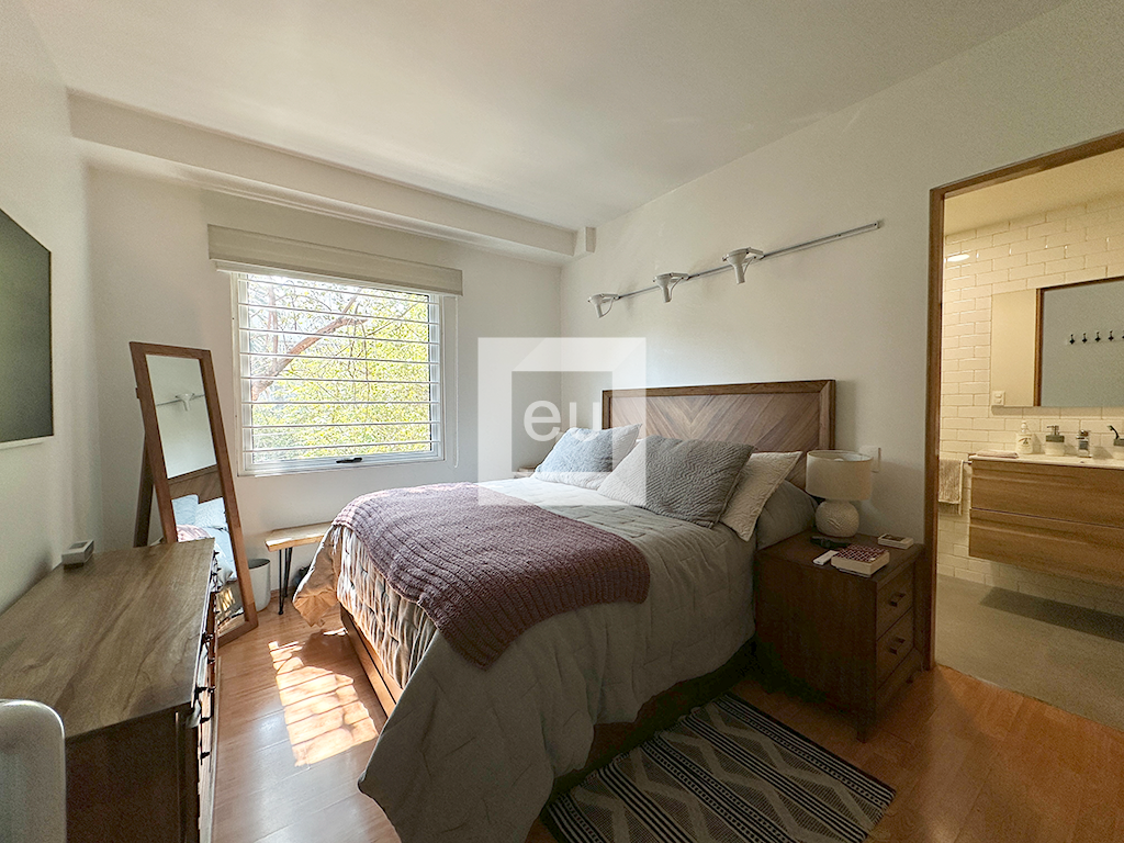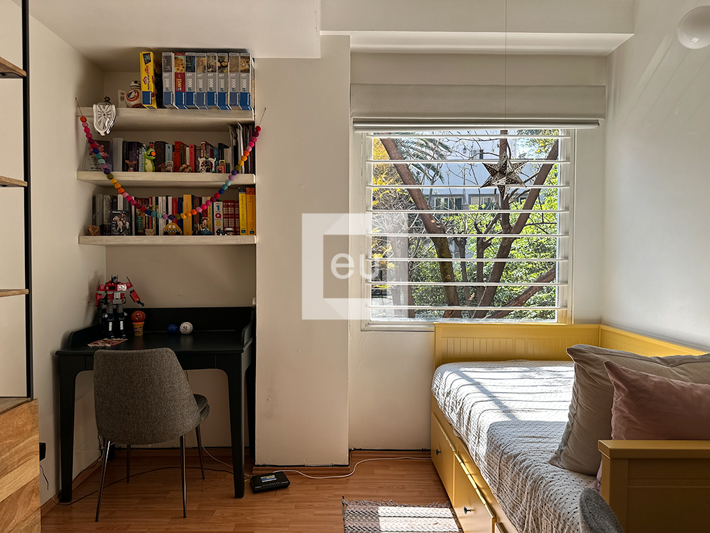 Departamento con una ubicación inmejorable, cerca de cafés, restaurantes, tiendas y galerías. Tiene una muy buena distribución y acabados de gran calidad. Las recámaras tienen muy buena iluminación y una hermosa vista arbolada. La recámara principal cuenta con doble vidrio y walk in closet. Se encuentra en un edificio de tan sólo 4 pisos y 6 departamentos en total. Este departamento es el único en el piso. Los baños y área de lavado tienen ventilación natural. Tiene dos lugares de estacionamiento con entrada independiente. No cuenta con vigilancia.
