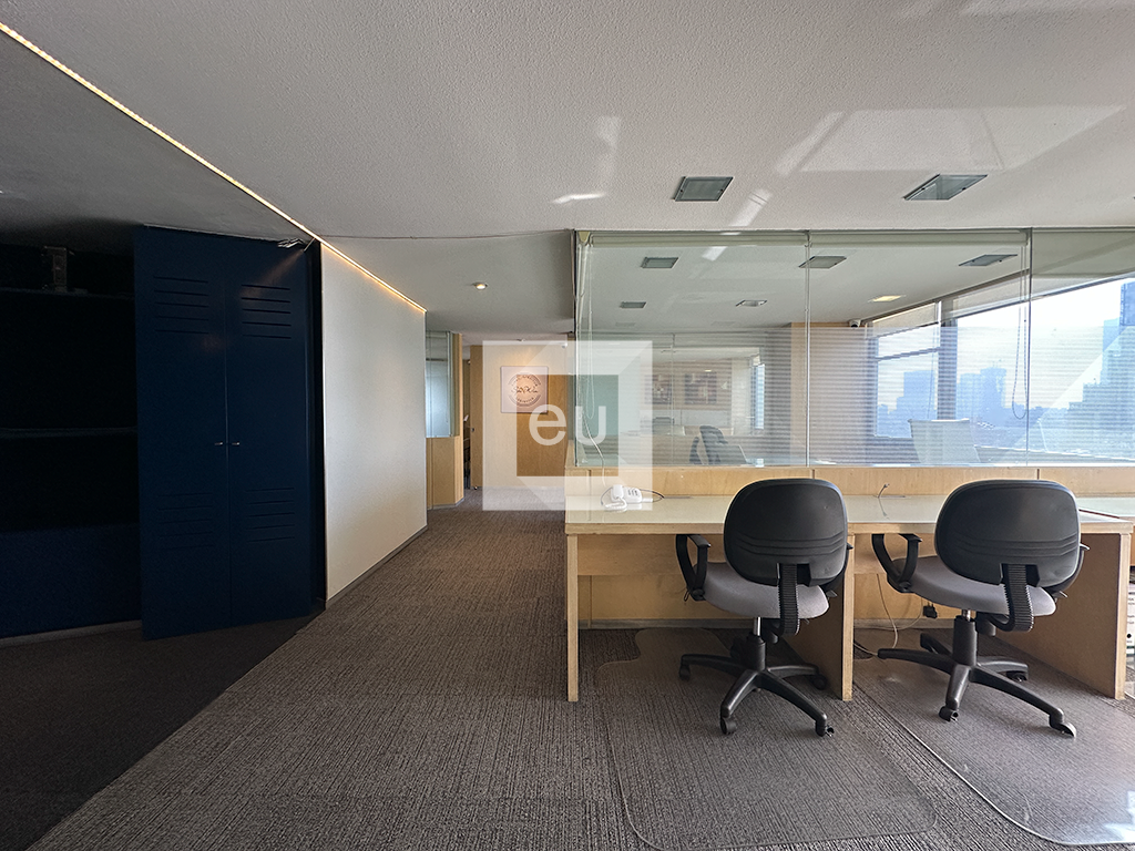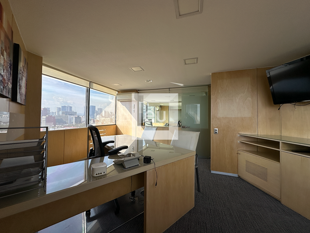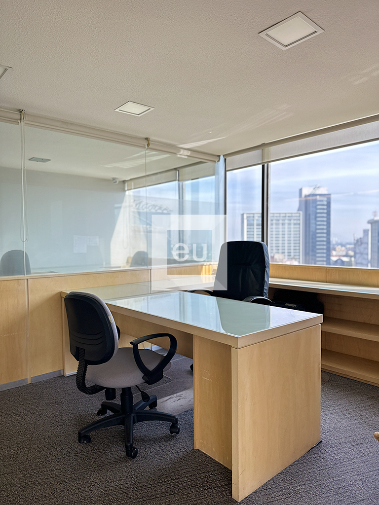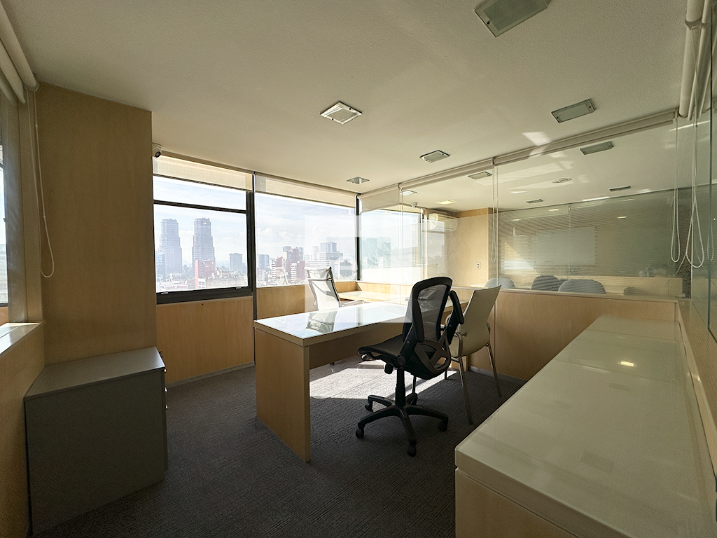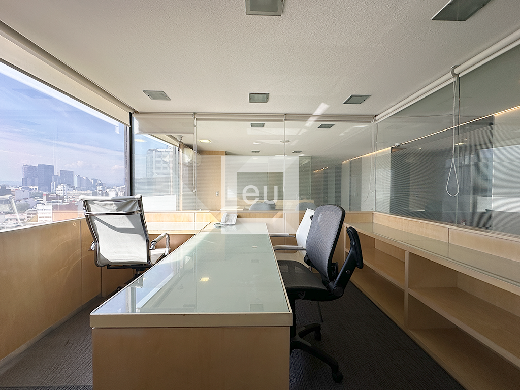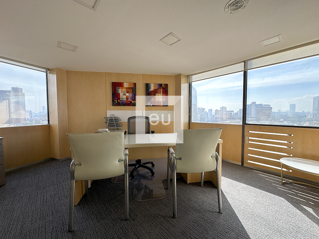 Oficina totalmente amueblada con una vista espectacular de la ciudad y una ubicación privilegiada. Cuenta con 4 privados, área de trabajo y sala de juntas. Además, tiene tres baños y un lugar de estacionamiento con servicio de valet parking. El edificio tiene vigilancia 24 horas.
