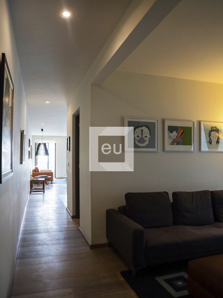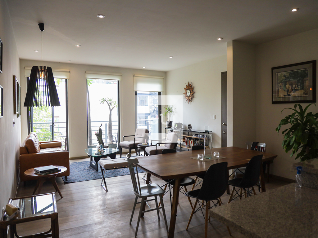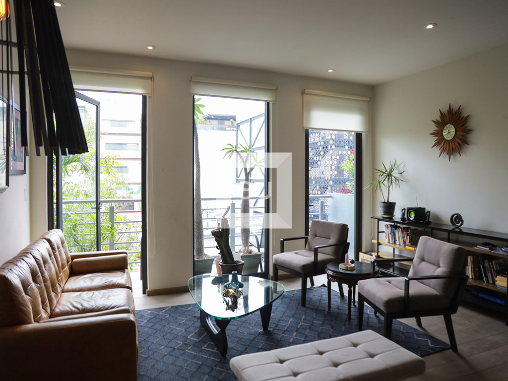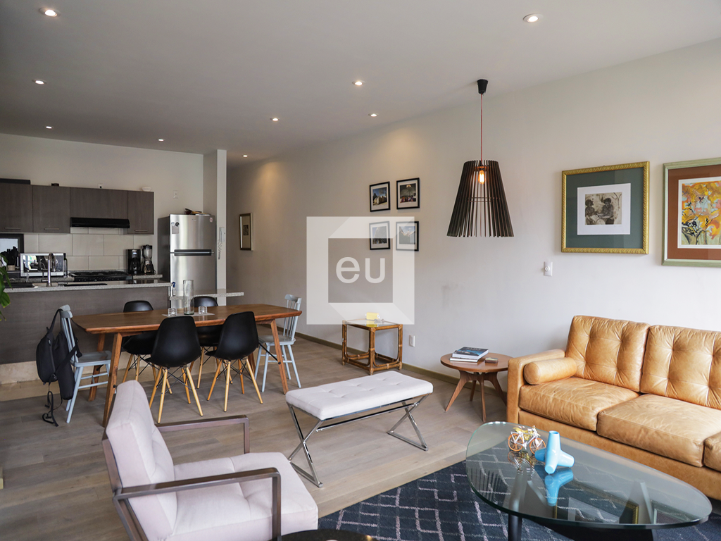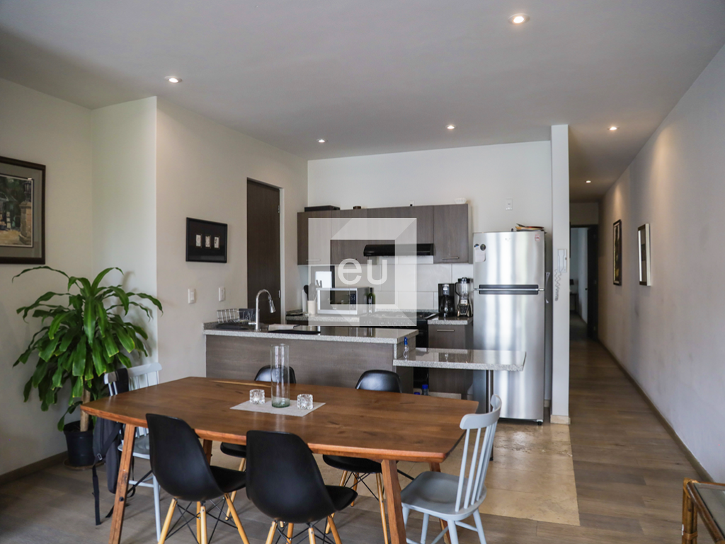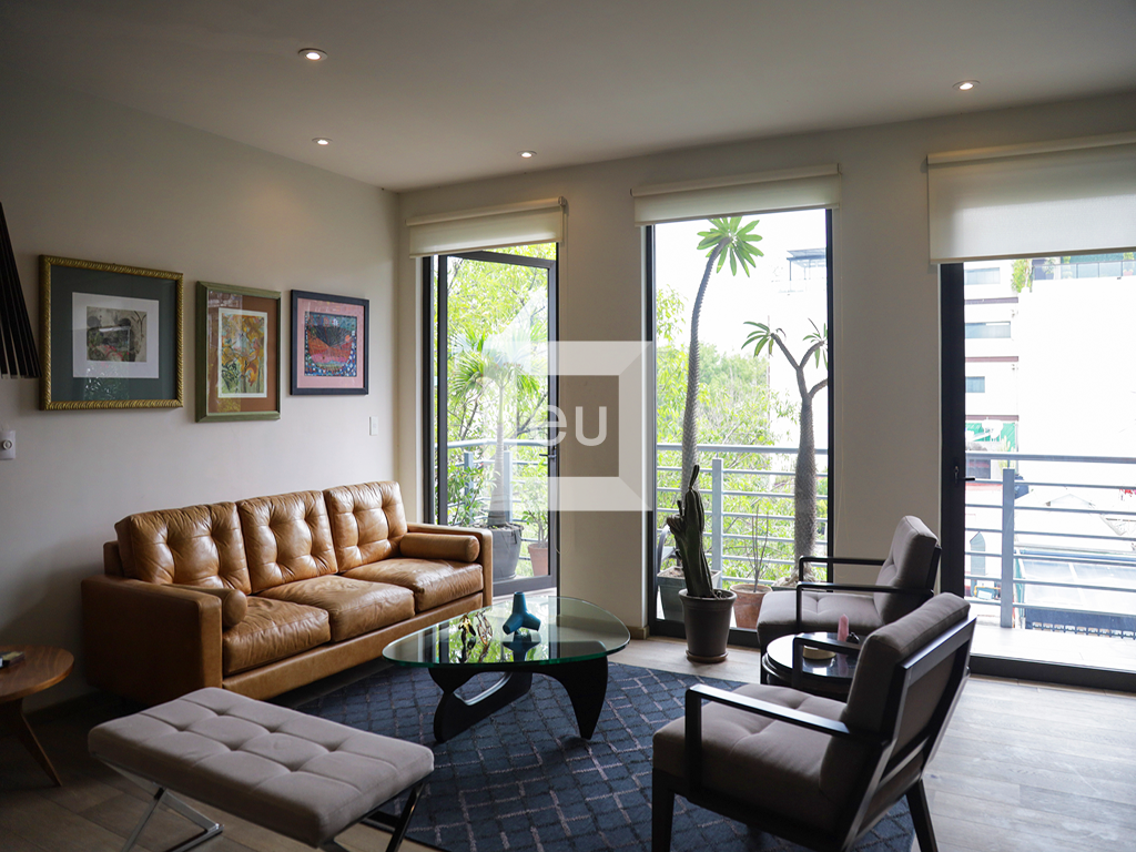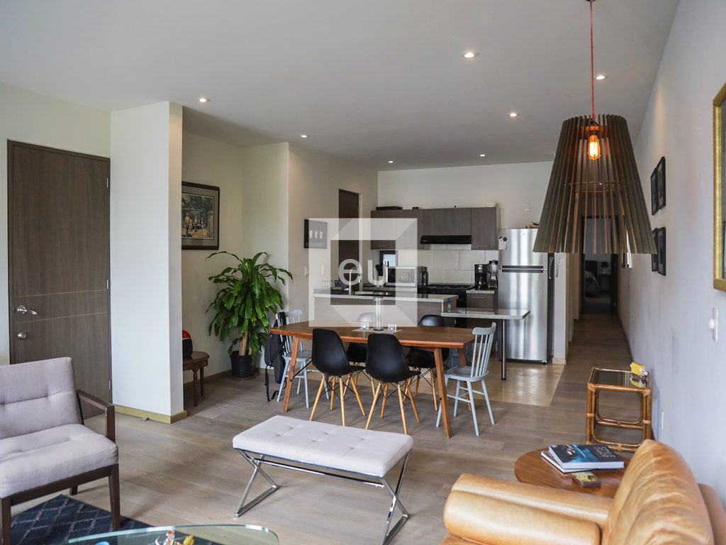 Lindo departamento exterior de estilo moderno, super iluminado, con hermosas vistas arboladas. Ubicado en una de las calles principales de la colonia que conecta con todo, muy cerca de la plaza Luis Cabrera y de los mejores restaurantes, cafés y galerías de la zona. Balcón, cocina abierta al área social, área de lavado de buen tamaño, sala de tv con opción cerrar para tener una tercer recamara. El edificio cuenta con vigilancia 24 horas y un roof garden de uso común con vistas panorámicas de la Ciudad.