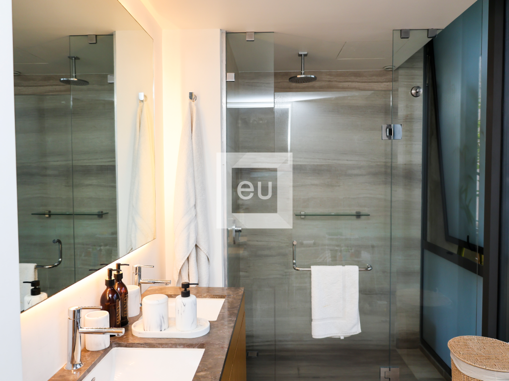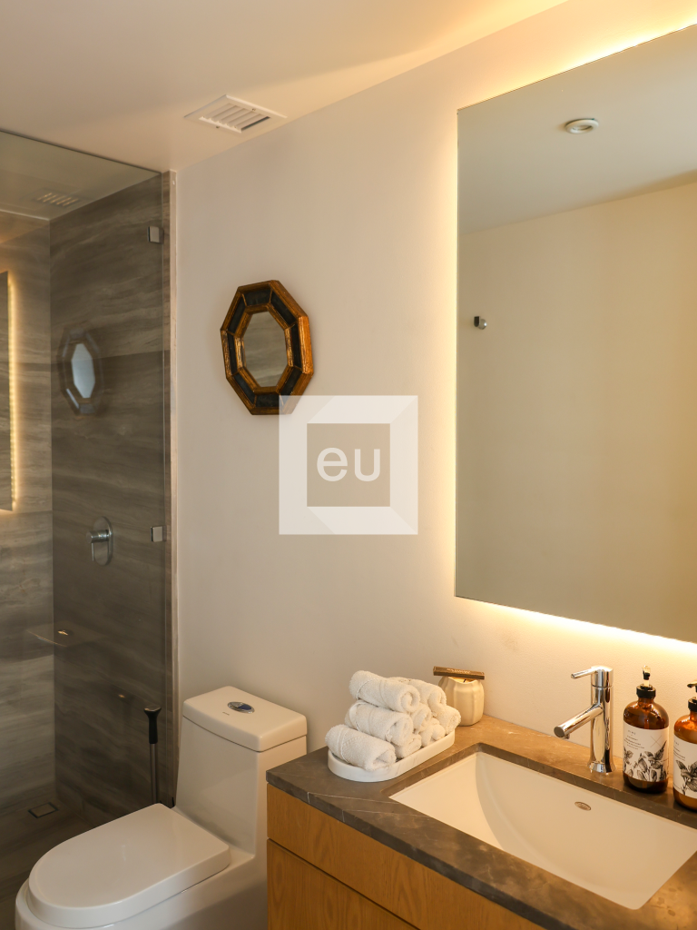 Apartment two blocks from Parque España for rent in the iconic Juan de la Barriera neighborhood of JSA. The apartment features luxurious finishes, an impeccable layout, and a private terrace overlooking trees. It boasts natural lighting and great exterior views. The master bedroom has a walk-in closet.