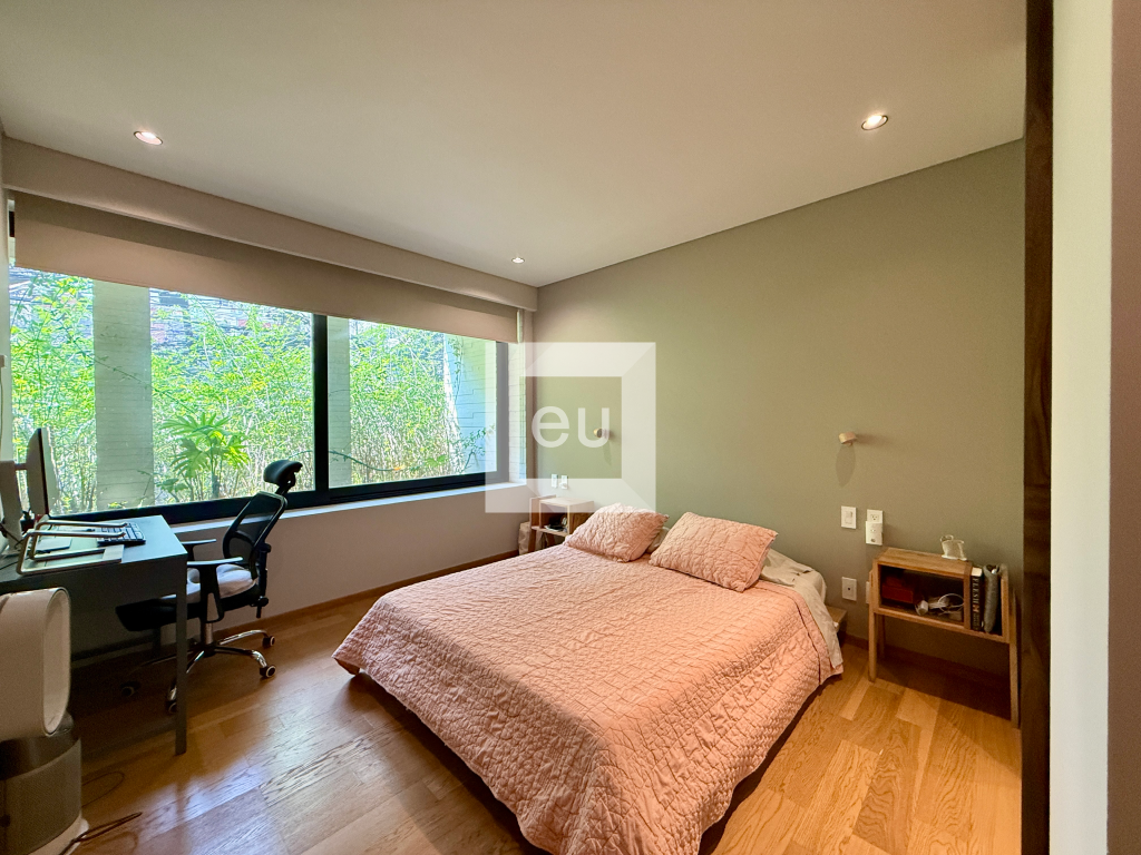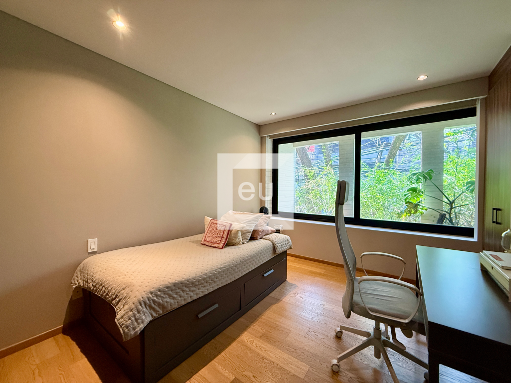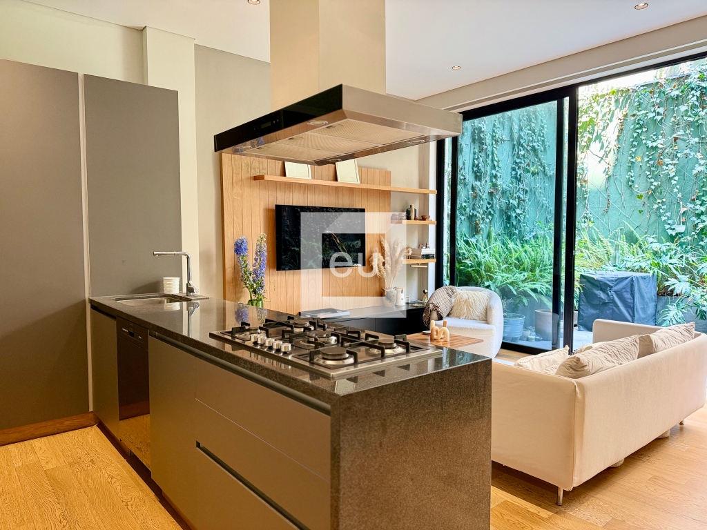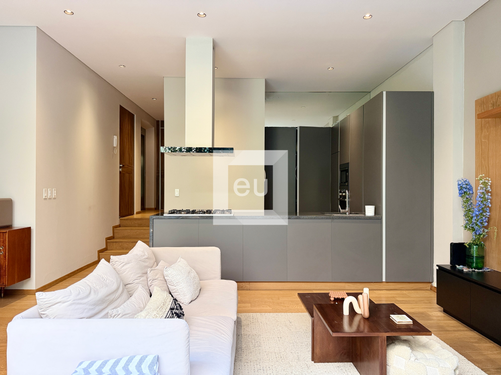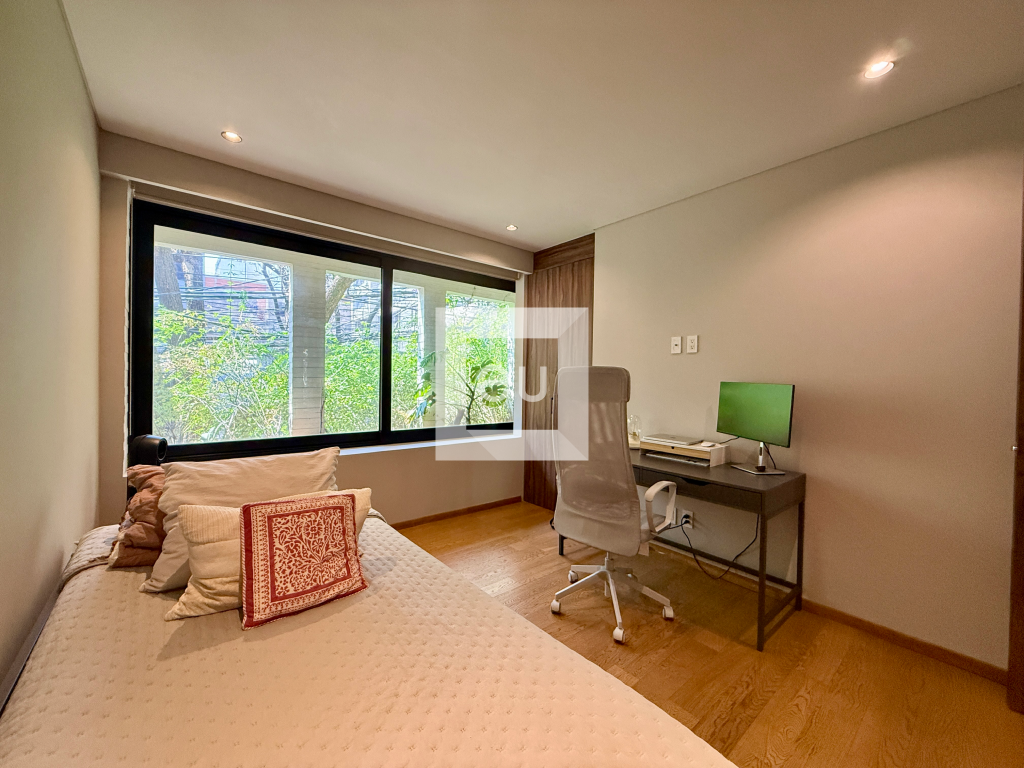 Cuenta con dos recámaras, dos baños completos, cocina abierta, techos de muy buena altura y una extraordinaria área exterior privada de 35 m², rodeada de vegetación, que le da una sensación muy especial de amplitud, privacidad y conexión con el exterior. El edificio cuenta con seguridad 12 horas.