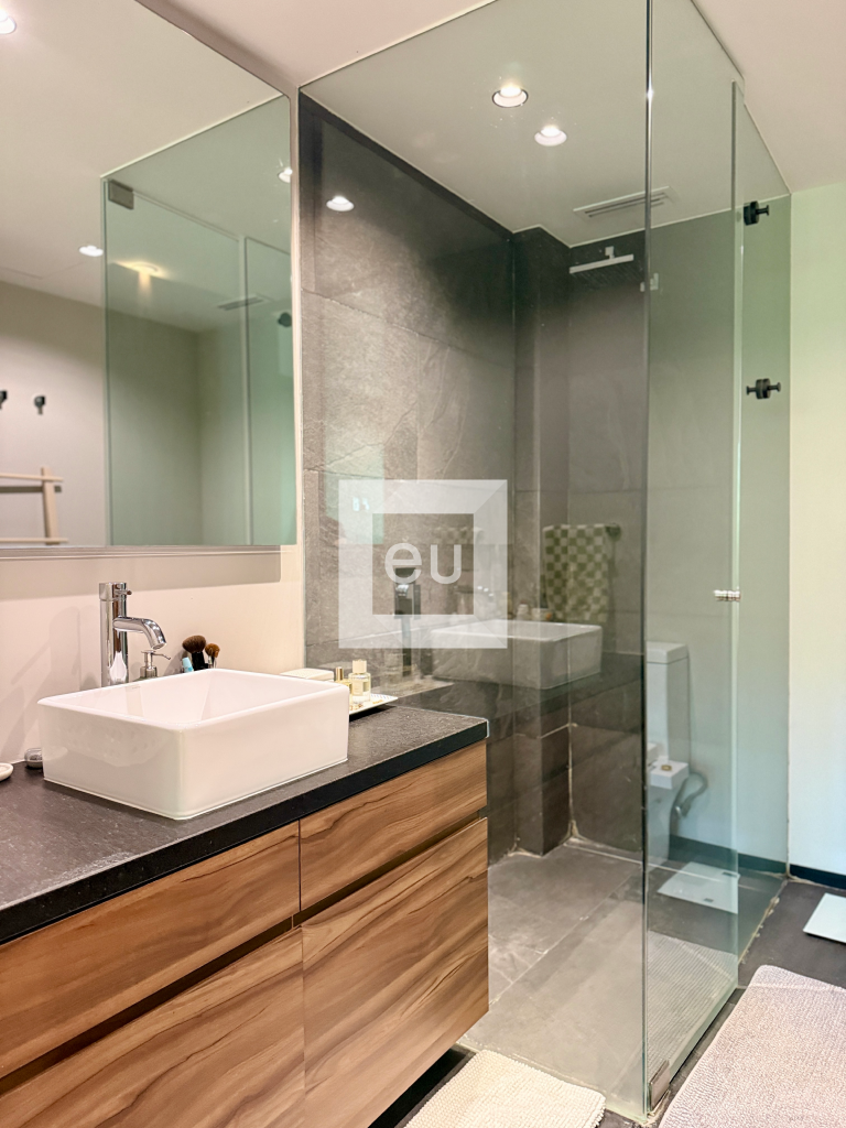 The apartment features two bedrooms, two full bathrooms, an open kitchen, and generous ceiling height throughout. Its standout feature is the extraordinary 35 m² private outdoor area, surrounded by greenery, which creates a rare sense of openness, privacy, and connection to the outdoors. The building offers 12-hour security.