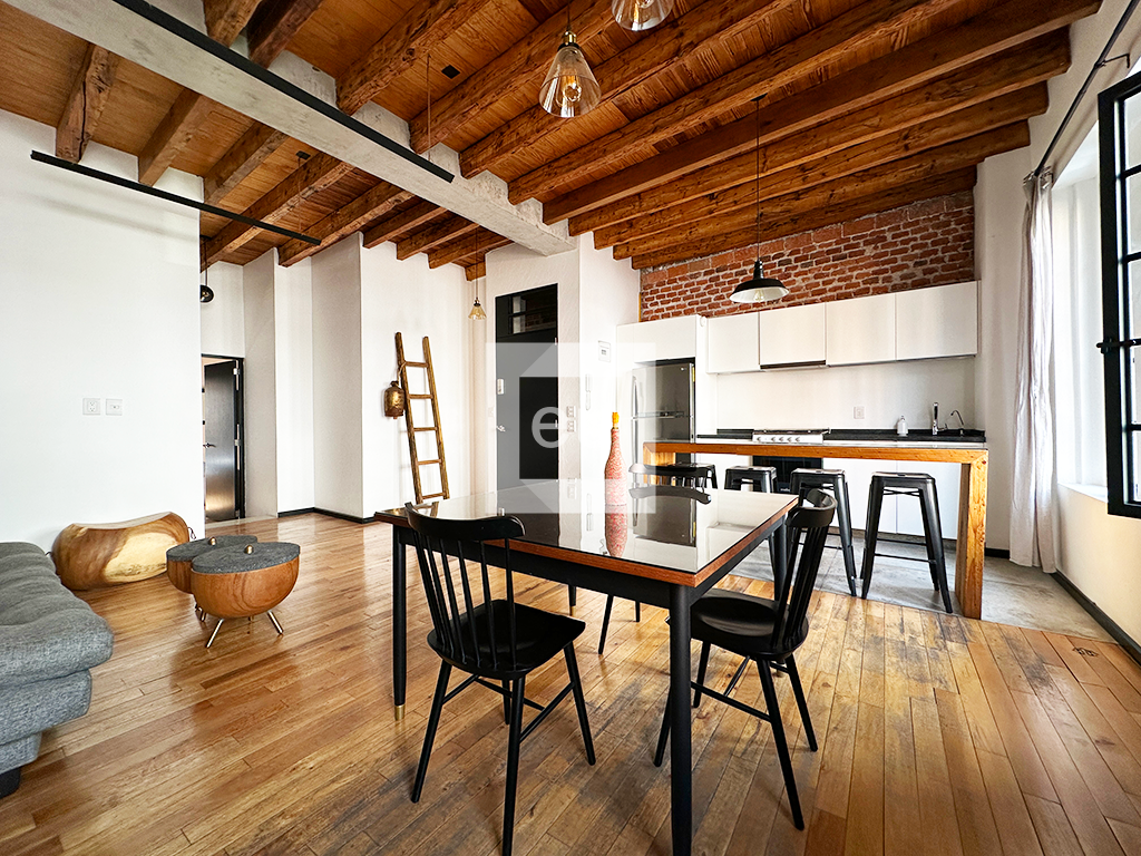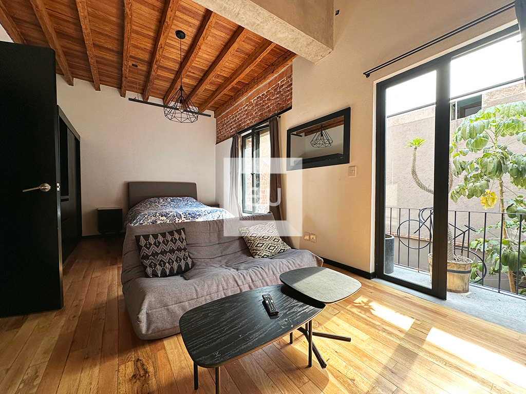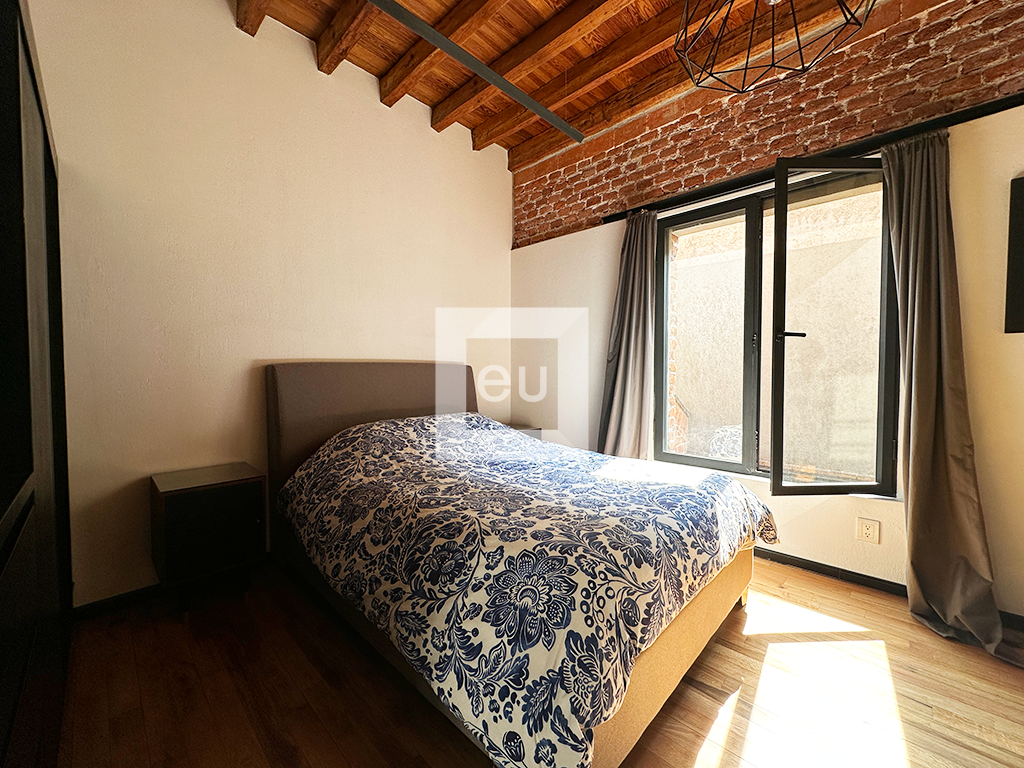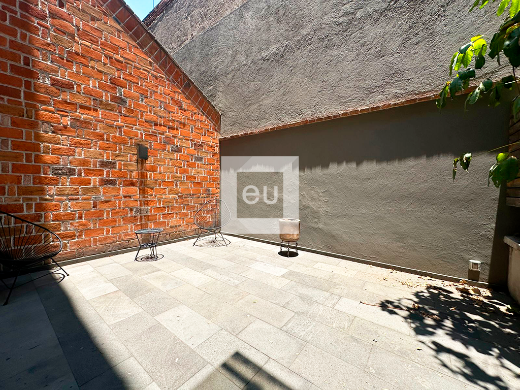 Bright apartment with high ceilings in a Porfirian-era building, completely remodeled. It is rented fully furnished and equipped, including air conditioning. It has a large walk-in closet and a study. It has a private-use terrace with a half bathroom. The building has 24-hour security and bicycle parking. Maintenance included.