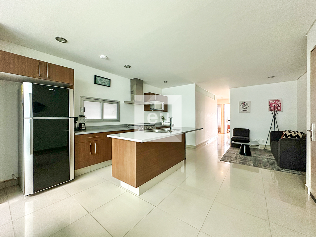 Departamento interior con buena iluminación. Tiene acabados modernos, se encuentra en un tercer piso y tiene una gran ubicación ya que está cerca de principales vías de acceso. Tiene muy buenos espacios y un balcón con acceso desde las recámaras. Cuenta con cocina abierta y cuarto de servicio. El edificio tiene vigilancia las 24 horas, un salón de usos múltiples y dos lugares de estacionamiento independientes.